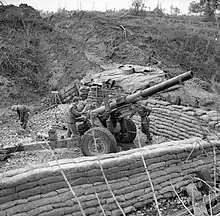 It continued with X Corps during Operation Olive to breach the Gothic Line in August, [18] and was with II Polish Corps in October.[10] For the Allied Spring 1945 offensive in Italy (Operation Grapeshot), 2nd AGRA supported V Corps with five medium regiments[10][19] (56th Heavy Rgt having been transferred to 21st Army Group in Belgium by that stage.[20][21])