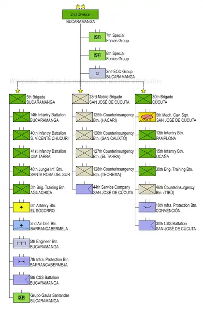 The 2nd Division (Spanish: Segunda division del Ejército Nacional de Colombia) is a Colombian National Army division based in the city of Bucaramanga consisting on three brigades; The 5th Brigade based in Bucaramanga, the 23rd Mobile Brigade based in San José de Cúcuta, the 30th Brigade based in Cúcuta. The division is supported by the 2nd Explosive Ordnance Disposal Group, 7th Special Forces Group and 8th Special Forces Group. It is currently participating in the War in Catatumbo.