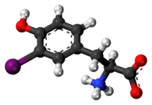 3-Iodotyrosine is an intermediate in the synthesis of thyroid hormones which is derived from iodination of tyrosine at the meta-position of the benzene ring. One unit can combine with diiodotyrosine to form triiodothyronine, as occurs in the colloid of the thyroid follicle. Two units can combine to form 3,3'-diiodothyronine.