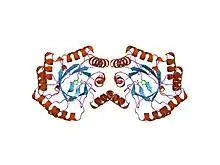 The best studied type I enzyme is from Escherichia coli (gene aroD) and related bacteria. It is a homodimeric protein. In fungi, dehydroquinase forms the core of the pentafunctional AROM complex, which catalyses five consecutive steps in the shikimate pathway.[3] A histidine is involved in the catalytic mechanism.[4]
