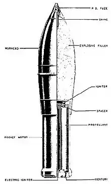 The warhead of the 30 cm Wurfkörper 42 Spreng was ovoid in shape and internally threaded for a nose fuze and filled with either TNT or incendiary mixture. The motor section consists of a threaded tubular section which screws into the warhead. The tail of the tube was threaded and a circular plate with eighteen venturis screwed into the tube. The venturis were drilled at a 12° 42' angle and the exhaust gasses spin stabilized the projectile. The motor was composed of seven sticks of solid-rocket fuel composed of nitrocellulose and diglycol dinitrate weighing 15 kg (33 lb) which was suspended from an internal grid. The center stick contains a length of quick match in a celluloid tube and ignites the six outer propellant sticks. The motor is essentially a scaled up 15 cm Wurfgranate 41.[1]