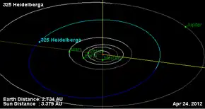 Heidelberga (minor planet designation: 325 Heidelberga) is a large main belt asteroid that was discovered by German astronomer Max Wolf on 4 March 1892 in Heidelberg. It is orbiting the Sun at a distance of 3.21 AU with an eccentricity (oval shape) of 0.159. The orbital plane is inclined at an angle of 8.55° to the ecliptic.[1]