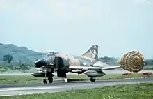 - ↑ Aircraft is McDonnell F-4C-21-MC Phantom II, serial 63-7705. Photo taken at Clark Air Base in 1979. The plane was later used as a damage repair trainer and salvaged. Baugher, Joe (26 July 2023). "1963 USAF Serial Numbers". Joe Baugher. Retrieved 28 August 2023.