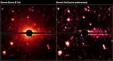 Due to its comet-like orbit and albedo, Don Quixote has been suspected to be an extinct comet.[9] However, infrared observations with the Spitzer Space Telescope at 4.5 μm revealed a faint coma and tail around the object.[4] The cometary activity is inferred by carbon dioxide (CO2) molecular band emission. In March 2018 a tail was observed at visible wavelengths for the first time.[10] The observation of cometary features during two apparitions suggests that cometary activity is recurrent and Don Quixote is most likely a weakly active comet.[11]