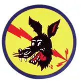 - ↑ Approved 18 October 1944. Description: On a yellow disc, wide border blue, a caricatured black wolf's head with white teeth, red tongue, and red mark in eft ear in front of a large red, jagged lightning flash bendwise, striking to sinister base, and having two small red flashes converging chevronwise inverted at the point of impact.
