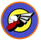 1. Approved 17 July 1944. Description: A yellow orange disc within a grayed blue annulet, piped back and bordered orange, surmounted by a white death's head with stylized wings of the sane, shaded blue, above a red aerial bomb, falling to dexter base, all casting deep drop shadow black.