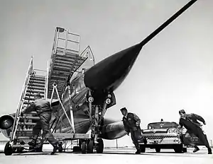 At the beginning of the Cuban Missile Crisis in October 1962, Only six B-58s in the entire SAC inventory were on alert. Even these aircraft were "second cycle" (follow on) sorties. Training was suspended, and the squadron, along with SAC's other B-58 squadrons, began placing its bombers on alert. By the first week of November, 84 B-58s were standing nuclear alert, and as SAC redeployed its Boeing KC-135 Stratotankers, 20 of these were "first cycle" sorties.[lower-alpha 4] Within a short time, this grew to 41 bombers. By 20 November, SAC resumed its normal alert posture, and half the squadron's aircraft were kept on alert.[8][9]