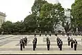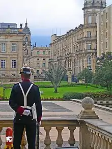 The Changing of the Guard (Cambio de guardia) is a 105 year old traditional military parade of the battalion that takes place on Wednesdays, Fridays and Sundays at 4 PM (COT) in the central square (Plaza de Armas) of the Casa de Nariño. It marks the changing of the security command at the palace. The changing of the guard involves the Fergusson Company and the battalion's military band and corps of drums.[4]