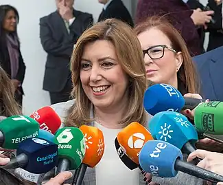 As two candidates had entered the race, attention focused on Díaz as she refused to publicly disclose her intentions. A party event on 11 February, allegedly intended as a vindication of the party's municipalism in Spain, became an improvised rally in support of Díaz, who had been invited by the event's organizer, Mayor of Vigo Abel Caballero. During the event, attended by 2,500 party officers and supporters, Díaz strongly hinted at her candidacy by claiming that she had "strength, hope, excitement" and "loved winning", while also pointing that the PSOE had to recover its spirit to "win elections".[130] Amid rumours that she intended to make her announcement after the Andalusia Day holiday on 28 February—in order to prevent eclipsing the holiday's institutional celebration—she responded that it was "a government event" and that she was not going to "talk about [her] party".[131][132] Díaz kept staging various acts as she was allegedly awaiting for the best time to make her announcement, seeking to prevent a possible succession struggle in Andalusia in the event she choose to step down as regional President and leader.[133] Finally on 12 March, several media outlets confirmed that Susana Díaz was poised to announce her bid during a large party rally in Madrid on 26 March,[134] with the party structure under her influence quickly coalescing around her in order to prevent a Pedro Sánchez's win in the primary.[135] In a speech to a crowd of 5,000 supporters, Susana Díaz formally announced her candidacy on 26 March as planned, supported by former PSOE leaders Felipe González, José Luis Rodríguez Zapatero and Alfredo Pérez Rubalcaba, as well as party figures such as Eduardo Madina, Alfonso Guerra, Carme Chacón, José Bono, 11 former ministers, dozens of local mayors and deputation presidents and most of the regional PSOE premiers, who had already rallied around her throughout the previous months.[136]