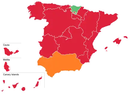 Concurrently, Pedro Sánchez increased his campaign agenda in Andalusia—which accounted for about a quarter of the party's membership—aware that Díaz's influence in the region and her expected strong primary showing there could dwarf his support in other communities.[137] As Díaz made her bid official, Sánchez proclaimed that there were only "two choices" for party members ahead of the May primaries: "the abstention [to Rajoy] or the [party's] grassroots",[138] while proclaiming that the PSOE itself had to choose whether to be "in front of" or "below or next" to the PP.[139] Sánchez also clashed with the PSOE's managing committee on his campaign's financing: Sánchez's crowdfunding system—through which he had received €38,000 in the first way of its opening, far beyond expectations[140]—was rejected by the later, as they accused Sánchez of not respecting laws on the financing of political parties. The caretaker committee perceived that donations to candidates for an internal party process were also subject to the same legal regulations applied to parties, and that any resulting responsibilities derived from a lack of control of such payments could result in the party bearing ultimate responsibility. As a result, the PSOE demanded all candidates to redirect their funding through a bank account under the party's ownership, something which was initially rejected by Sánchez—who also questioned the legality of such a move—to the party's outrage.[141][142][143] On 28 March, the Spanish Court of Auditors ruled in favour of the party's stance and required for Sánchez to respect the financing rules laid down by PSOE. Sánchez reluctantly complied and subsequently shut down his crowdfunding.[144]
