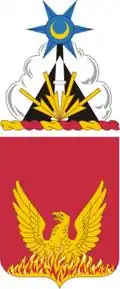 The shield is red for Artillery. The fabulous bird, the phoenix, symbolizes the reactivation and restoration of the organization.