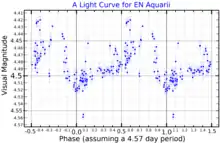 The apparent magnitude of 3 Aquarii varies by up to 0.06 magnitudes, which was first noted in the 1960s.[17][18] It was formally listed as a variable star in 1973, and given the variable star designation EN Aquarii.[19] It is classified as an irregular variable,[4] although detailed analysis shows multiple possible periods.[20]