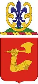 - Crest: The five broken chain links symbolize the unit's five battle honors. The fleur-de-lis refers to the area of Europe where they fought in World War II. The color green alludes to hope and liberation.