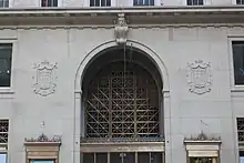 Decorative elements were used sparingly on the facade. These included the two-story coffer-vaulted main entrance on Fifth Avenue, the balustrade and balconies on the facade, the ninth- and tenth-floor colonnade, and the copper cornice on the facade above the tenth floor.[3] The main entrance was spanned by an arch topped by an elaborately decorated keystone, while cartouches and other decorations were present in other parts of the entrance vestibule.[6] "Multi-light windows" were added on the third through tenth floors, deviating from the plate glass windows typically used in retail buildings, which one critic said "added much to the appearance of the openings".[4] In addition to the main entrance, there were smaller side entrances on 38th and 39th Streets.[8]