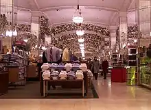 Travertine was used for the surface of the first floor.[9] Cork surfaces were incorporated into the selling counters to reduce strain on employees who leaned on the counters.[7] Wood was also used in the decorative features and on the fifth floor, where there was originally a carpet department.[4]