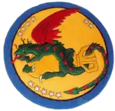 1. Approved 25 Aug 43. Description: On a tan disc bordure blue, a green dragon, wings, tail barb, tongue, nose, and facial trimmings red, horns black, entwined about a large yellow aerial bomb, eleven white stars arranged four, two and five about outer circumference of tan disc.