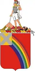 Through its Battery B, the 246th Coast Artillery traces its history back to 1856 and its coat of arms reflects the highlights of its past. The shield has artillery red for its background, indicative of its branch of service. The saltire, upper left hand corner, is in honor of the service of one of its units (the Danville Grays) in the Confederate Army in the American Civil War. The rainbow calls attention to the service several of its units saw in the Rainbow (42nd) Division of the First World War. The regimental motto – Prepared to Defend – is in keeping with its mission. For this unit, the shield of the coat of arms is also the distinctive unit insignia.[2][7]