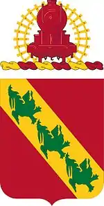 The shield is red for Artillery. The bend is taken from the arms of Lorraine, which is gold with three golden alerions on a red bend, with the colors reversed. The three oozlefinches are used instead of the alerions. The green oozlefinch was the device on the shoulder patch worn by the railway artillery reserve in France, of which this Regiment was a unit. The locomotive and épi show the character of the Regiment. The motto translates to "We Support" and alludes to the mission of railway artillery.