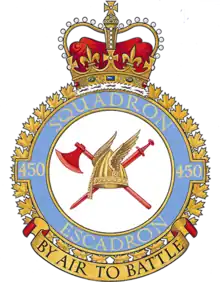 450 Tactical Helicopter Squadron is a Royal Canadian Air Force helicopter squadron. During the Second World War, the numerical designation of 450 was originally given to No. 450 Squadron of the Royal Australian Air Force, which flew under that number from 1941 until 1945 in the Middle East and Italy.[1] Canadian Article XV squadrons during the Second World War had used numbers from 400 to 449; however, due to an administrative error, the "450" designation was used when squadron formed at RCAF Station St. Hubert, Quebec, on March 29, 1968.[2]