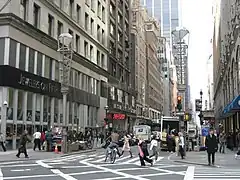 The Diamond District is a commercial stretch between Fifth and Sixth avenues in Midtown Manhattan. Until the 1920s, New York's diamond epicenter was Maiden Lane, four blocks north of Wall Street.[4] The new Diamond District was formed when dealers moved north from an earlier district near Canal Street and the Bowery that was created in the 1920s, and from a second district located in the Financial District, near the intersection of Fulton and Nassau streets, which started in 1931, and also from the at one time jewelry district of Maiden Lane, which had existed since the 18th century.