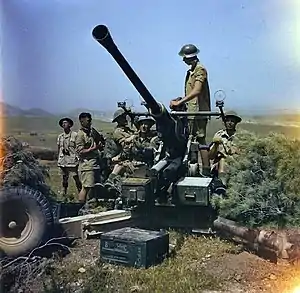 Eighth Army landed in Calabria in Operation Baytown on 3 September, and advanced up the 'toe' of Italy against light opposition. 78th Division began arriving on 22 September, and was ordered to advance towards Foggia where there was an important airfield complex. Possession of these and other airfields later allowed the Allies to develop complete air superiority over Italy. Beyond Foggia two of 78th Division's brigades made an amphibious landing with a Commando force on 3 October to seize Termoli in Operation Devon. All the division's guns and supporting armour remained south of the River Biferno until the Sappers could construct fords and bridges. The link-up with the hard-pressed amphibious force was achieved on 6 October. 78th Division next forced a bridgehead over the River Trigno on 27 October, but the follow-up operation to capture Vasto was delayed by bad weather. By 9 November the division had reached the River Sangro, and despite the flooding achieved bridgeheads by 22 November. Bridging sites normally required AA defence, but bad weather halted air operations on both sides. The crossings were finally achieved, and on 1 December 78th Division broke into the Bernhardt Line defences beyond. The division was then rested.[15][27][28]