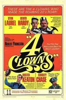 4 Clowns is a 1970 documentary compilation film written and directed by Robert Youngson that studies the golden age of comedy through a compilation of rare silent film footage of the works of Stan Laurel, Oliver Hardy, Charley Chase and Buster Keaton.[1] It was the last feature film project of producer, director, and writer Robert Youngson.[2][3][4][5]