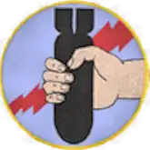 - ↑ Approved 10 January 1962. Description: On an Air Force blue disc bordered Air Force golden yellow, a cloud formation divided bend sinisterwise gray and white, an Air Force golden yellow lightning flash issuing from the division to dexter chief, the white part of the cloud surmounted in sinister by a knight's helmet in profile, silhouetted gray; over all bendwise a red and white msssile.