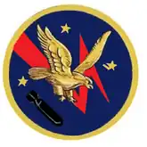 1. Approved 10 July 1943. Description: On a light blue disc, border yellow orange a red lightning bolt bendwise surmounted by a golden falcon, outlined black; three mullets gold, one in chief, one to sinister, and one to dexter, in base a black aerial bomb falling bendwise.