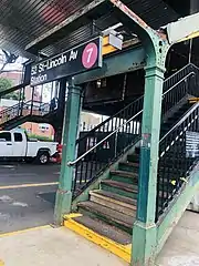 This is the southernmost (geographical west) station on the IRT Flushing Line that is on a steel viaduct above Roosevelt Avenue. West of this station, the line curves and becomes a concrete viaduct above Queens Boulevard until 32nd Place.
