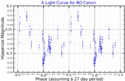 53 Cancri is a semiregular variable that varies between magnitude 5.9 and 6.4 with a period of 27 days.[3] There is a suspected second period of 270 days.[7]