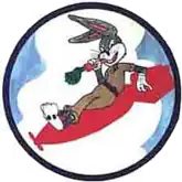 - ↑ Approved 2 December 1943. Description: On a light blue violet disc, border black, "Bugs Bunny" proper, in tan flying suit, reclining on a large red aerial bomb and chewing on a carrot proper, all in front of a large white cloud formation.