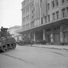 Sherman tanks and troops from the 5th (Scottish) Parachute Battalion, 2nd Parachute Brigade, during operations against members of ELAS in Athens, Greece, 6 December 1944.
