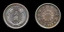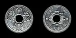 The 5 sen coin (五銭硬貨) was a Japanese coin worth one twentieth of a Japanese yen, as 100 sen equalled 1 yen.[1] These coins were minted from the late 19th century until the end of World War II. Like the other denominations of sen, these coins were eventually taken out of circulation at the end of 1953.[2] While not in circulation any more, these coins are bought and sold by numismatists for academic study, and by those with a hobby.
