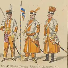 In 1764–89, all officers and men had white cockades, with the officers and towarzycz also having white feathers on top of the cockades. The towarzycz had green belts and sashes, while the officers had gold-laces green waistcoats.[1]