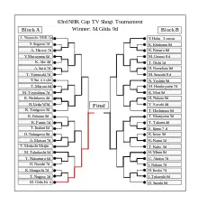 The 63rd NHK Cup, or as it is officially known the 63rd NHK Cup TV Shogi Tournament (第63回NHK杯テレビ将棋トーナメント, dairokujūsankai enueichikeihai terebi shōgi tōnamento) was a professional shogi tournament organized by the Japan Shogi Association and sponsored by Japan's public broadcaster NHK. Play began on April 7, 2013, and ended on March 23, 2014. The 50-player single elimination tournament was won by Masataka Gōda. All of the tournament games were shown on NHK-E. The host (司会者, shikaisha) during the NHK-E broadcasts was female professional Rieko Yauchi.[1]