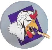 - ↑ Approved 18 January 1944. Description: On a disc light turquoise blue, thin border ultramarine blue, piped white, an ultramarine blue rectangle bendwise surmounted by the head of a game cock white, beak yellow, comb and wattles red, wearing a white aviator's helmet and goggles, outlined black, and blowing a yellow and white aerial bomb from the beak toward the base.