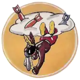 2. Approved 29 December 1943. Description: On a light grayed yellow orange disc, thin border of the same [color] piped white, a caricatured Indian warrior proper, wearing light red trousers, yellow moccasins, red, yellow, and blue head band with one red and one yellow feather, hanging by his heels from a large white cloud formation in chief, and shooting a blue violet aerial bomb toward the base with yellow beanshooter; cloud formation supporting reserve stock of aerial bombs, one red violet, one orange, and one blue violet.