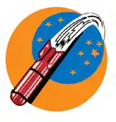 1. Approved 6 September 1943. Description: Over and through a disc formed by a decrescent moon yellow orange, imposed on a field of light blue, flecked with eleven yellow stars, a red comet aerial bomb banded black, leaving trail white to rear, and casting dark, wide drop shadow.