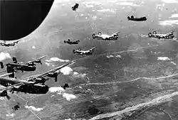 The squadron arrived at its combat station, Manduria Airfield, Italy, in early January 1944 and began engaging in the strategic bombing campaign against Germany, primarily striking targets in Austria, Czechoslovakia, France, Germany, Hungary, Italy, and the Balkans. The squadron's first mission was flown against Mostar Airfield, Yugoslavia on 8 January.[7][8] Targets included aircraft factories and assembly plants, oil refineries, marshalling yards, airfields and storage areas.[5] Shortly after arriving in theater, the squadron participated in Big Week, attacking aircraft factories at Regensburg, Germany and Steyr, Austria. It was awarded a Distinguished Unit Citation (DUC) for its attack on the Messerschmitt factory at Regensburg on 25 February, despite bad weather, heavy flak in the target area and enroute attacks by enemy interceptor aircraft. The 450th Group led the 47th Bombardment Wing on the attack.[9] The 722d earned a second DUC for an attack on rail yards near Ploesti on 5 April, when it fought its way through "relentless" attacks by enemy aircraft to reach the target.[5] The rail yards were a vital link in the transportation of petroleum products from the Ploesti refineries to the eastern front.[10] The 450th Group again led the 47th Wing on this mission.[5][11]