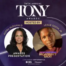 The 74th Tony Awards were held on September 26, 2021, to recognize achievement in Broadway productions during the 2019–20 season. After being delayed due to the COVID-19 pandemic in New York City, the ceremony was held at the Winter Garden Theatre and was broadcast in two separate parts on CBS and Paramount+.[1] Audra McDonald and Leslie Odom Jr. served as hosts.