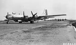 At Walker, it received its initial cadre from elements of the 40th Bombardment Group and began to fly a mix of Martin B-26 Marauders and Boeing B-17 Flying Fortresses.[1][2] Delays in producing the B-29, labor disputes at the engine manufacturer, and modifications to the planes to make them ready for combat resulted in belated deliveries to combat units and it was close to the end of 1943 before aircrews could train in the new bomber in any number. Ground echelon personnel began shipping out in December 1943 to prepare the airfields for the bombers without completing their training in the United States.[4] The air echelon of the squadron trained with the B-29 at Walker until March 1944, when it departed for its first overseas base, Piardoba Airfield, Bengal, India,[1] to participate in Operation Matterhorn, which called for B-29 attacks from advanced bases in China, while the bombers' main bases were in India.[5]