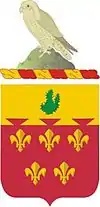 • Shield: The shield is red for artillery. The yellow dovetailed chief symbolizes the formation of the organization from cavalry. The cactus indicates service as cavalry on the Mexican border. The five fleurs-de-lis signify the five major engagements in France in World War I as artillery.