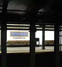 There are round columns painted green along the length of both platforms.[35] There are mosaic trim lines, and mosaic displaying the name of the station on the original sections of the station platforms.[36][37] The remainders of both platforms have cream-colored tiles and a salmon trim line with "77TH ST" written on it in black Sans Serif font at regular intervals.[38] These tiles were installed during the late 1950s renovation.