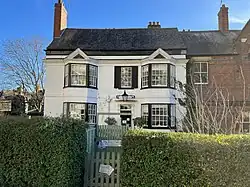 The front is two storeys with two canted and pedimented bay windows on each floor. These, and the central door-case, date to the early 1800s.[2]