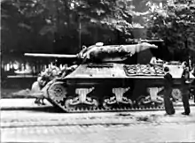 Following VE-Day on 7 May, the battalion was tasked with guarding German prisoners, slowly transitioning to more general occupation duties before being withdrawn to Germany in late July to prepare for demobilization. The battalion was eventually shipped to New York three months later, where it was finally inactivated on 30 October.[29] During its 297 days on active service, it had lost twenty-three men killed on active service, along with eight tank destroyers (four M10s and four M36s). In return, it had destroyed twenty-three German tanks (one a Tiger heavy tank) and ten self-propelled guns, along with a large number of light vehicles and fixed positions,[30] this was around average for a tank destroyer battalion, with perhaps lighter than usual casualties.[31] During the war, men of the battalion were awarded nine Silver Stars and seventy-two Bronze Stars, whilst two more men were awarded the French Croix de Guerre.[30] The battalion as a whole was mentioned in the Belgian Army orders of the day for its service in the Ardennes, whilst the Distinguished Unit Citation was awarded to the 1st Platoon, Company A, for its service.[32]