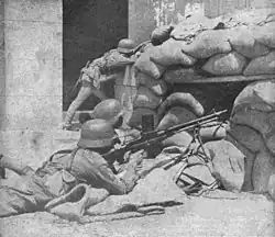 Later in 1937 the 87th Division took part in the Battle of Shanghai at the outbreak of the war between the Republic of China and the Empire of Japan.[5] When Zhang Zhizhong, 71st Corps commander, ordered the 87th and 88th—equipped with their German helmets and stick grenades—to move into the city the former used trucks to quickly deploy into downtown Shanghai.[8] It was commanded by Lieutenant General Wang Jingjiu during the battle.[9] On August 14, the unit advanced against the Kung-ta Textile Mill, where the Japanese Special Naval Landing Force troops were based.[10] During the battle it also cooperated with the 88th Division. They jointly advanced against the Imperial Japanese Army forces at the Huishan wharf on August 17,[11] and on the following day the 87th broke through Japanese lines at Yangshupu district, linking up with the 86th Division.[10] It remained engaged in the downtown area before moving out to the west of Shanghai in late October, to the Suzhou Creek. Being as wide as river, it was an obstacle that the Japanese needed to secure to surround Chinese forces in Shanghai in a massive pocket. Despite Japanese shelling and airstrikes the 87th Division managed to fight off multiple attempts to take the position. Upwards of 16,000 members of the division were killed (including replacements for the losses).[12] Subsequently, the unit took part in the Battle of Nanjing, by which point it received Major General Shen Fazao as its new commander.[13][14] By the time the engagement at Nanjing was over, barely 300 soldiers of the division were still alive, but despite having lost many of its original personnel it still had an elite aura in the eyes of many Chinese commanders.[12]