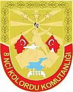 The 8th Corps (Turkish: 8. Kolordu) is a field corps of the Turkish Army. It is headquartered at Elazığ in Elazığ Province. It appeared to have been under command of General Osman Erbaş, until his death in a 2021 helicopter crash. Current leadership after the crash is unknown.[1][2]