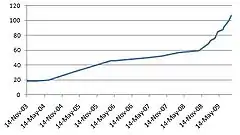 As can be seen in the graph to the right, the retailer had seen rapid growth since the end of 2008, doubling the number of their stores from 61 in November 2008 to 123 in December 2009.[27] Company owner Lalani said that finding sites was getting easier because of the new empty rate tax on commercial property. Whereas, previously, landlords would decline to have a discount shop filling their empty stores, they were less reluctant to fill them with discount stores, as they were being charged for stores which lie empty.[23] Stuart Donnelly, head of property at 99p Stores, noted that landlords were being much more proactive, inviting potential retailers to come and have a look at their locations with the hope of them taking up a lease, as the property market has been badly affected by the recession, allowing the company to drive competitive deals to further expand their portfolio of stores with less expenditure, something that wouldn't have been possible just a few years previously.[28] Landlords were regarding 99p Stores as an anchor tenant due to the significant number of customers one of their stores can bring to a location.[6]