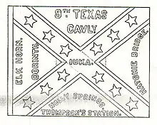 The 9th Texas Cavalry Regiment was a unit of mounted volunteers that fought in the Confederate States Army during the American Civil War. The regiment fought at Round Mountain and Bird Creek (Chusto-Talasah) in 1861, Pea Ridge, Siege of Corinth, Second Corinth, Hatchie's Bridge and the Holly Springs Raid in 1862, and in the Atlanta campaign, Franklin, and Murfreesboro in 1864. The unit fought dismounted at Second Corinth and Hatchie's Bridge before being remounted as cavalry for the remainder of the war. The regiment surrendered to Federal forces on 4 May 1865 and its remaining personnel were paroled.