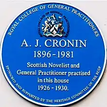 Archibald Joseph Cronin (19 July 1896 – 6 January 1981), known as A. J. Cronin, was a Scottish physician and novelist.[2] His best-known novel is The Citadel (1937), about a Scottish doctor who serves in a Welsh mining village before achieving success in London, where he becomes disillusioned about the venality and incompetence of some doctors. Cronin knew both areas, as a medical inspector of mines and as a doctor in Harley Street. The book exposed unfairness and malpractice in British medicine and helped to inspire the National Health Service. [3]